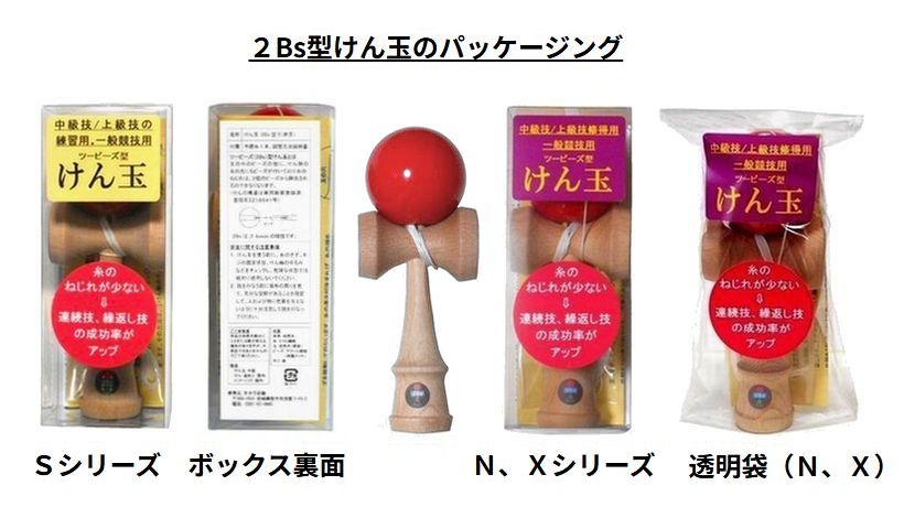 技用けん玉の三つの改良点に基づいて、その進化型として 2Bs型の特徴を説明します。 1.ビーズを使った糸のよりもどし [24ページ掲載の要点] 試技中に糸のよじれが生じる と技が決めにくくなる。このよじれをもどすには玉の中の糸 の先端にビーズをつけるとよい。この方法は協会支部「ニコ ンの会」の会員から提示された。 2Bs型ではビーズが2個になり、ねじれ除去が倍増してい るので、連続技や繰返し技などの成功率が大幅にアップしま す。さらに、練習中の糸よじれ直しがなくなり、練習効率が 上がります。